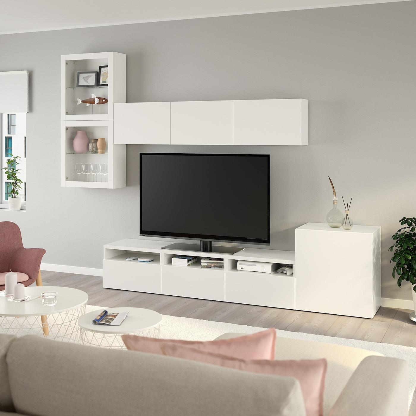 Настенные шкафчики позволяют эффективно использовать пространство над телевизором.