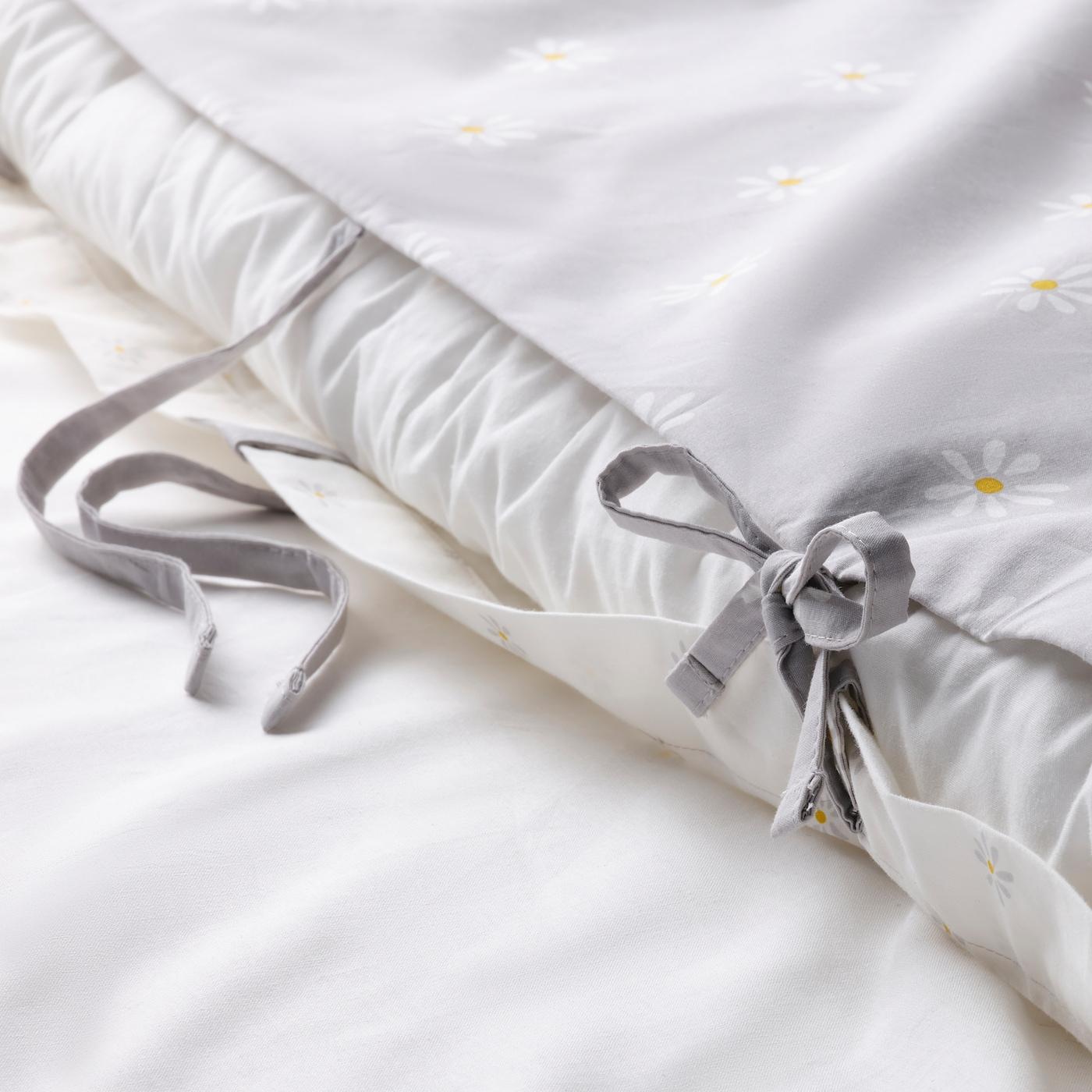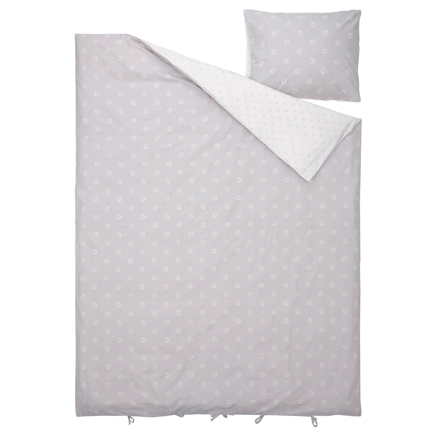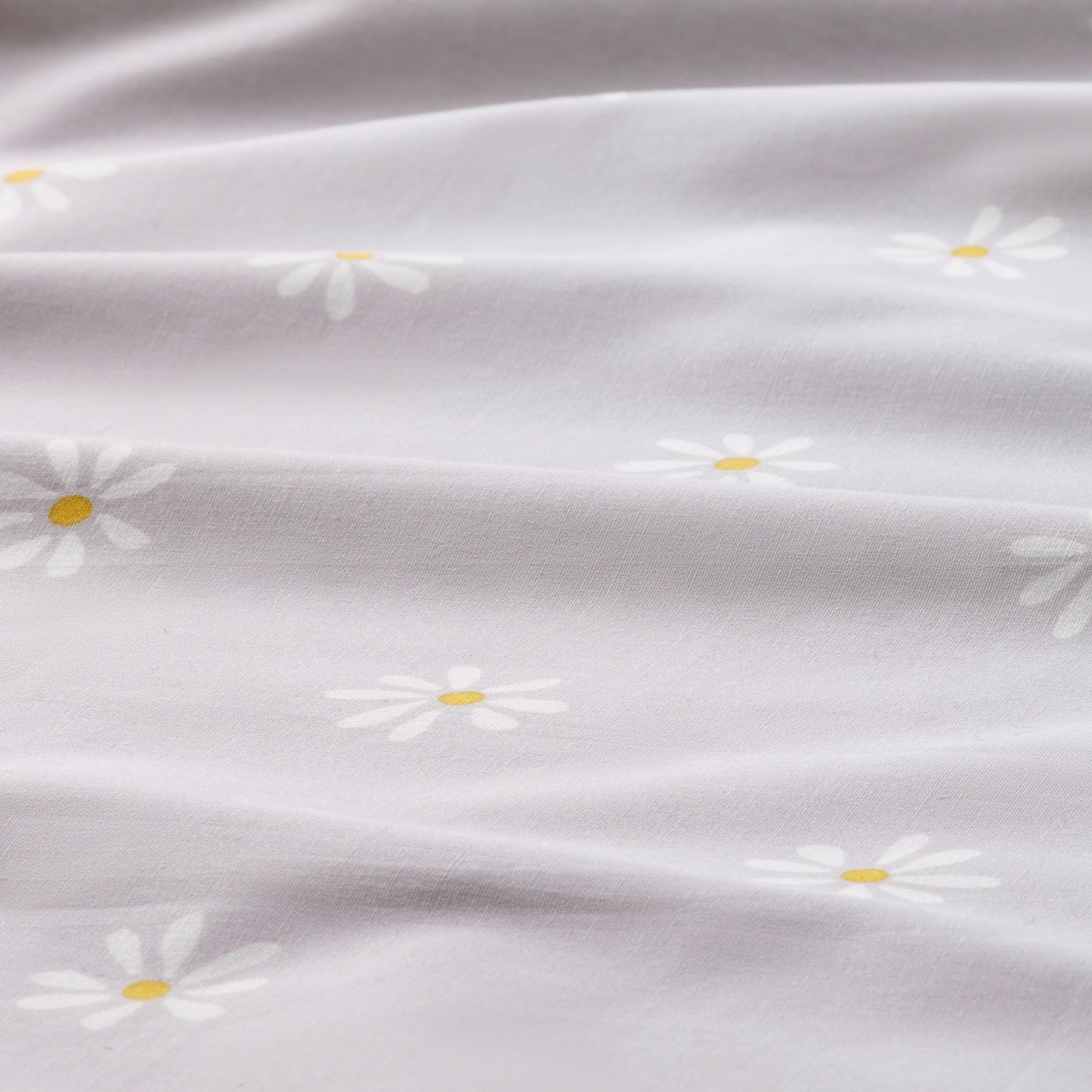 Одна сторона постельного белья серая, другая — белая. С обеих сторон ткань украшает орнамент в виде ромашек разного размера.
