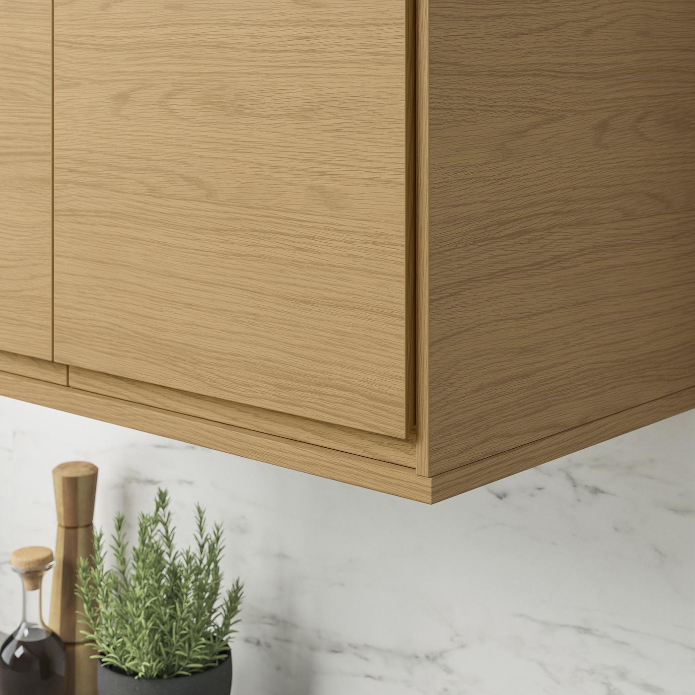Можно использовать как декоративный карниз под навесными шкафами, чтобы спрятать подсветку, провода и розетки, а также установить на верхний край навесных и высоких шкафов.