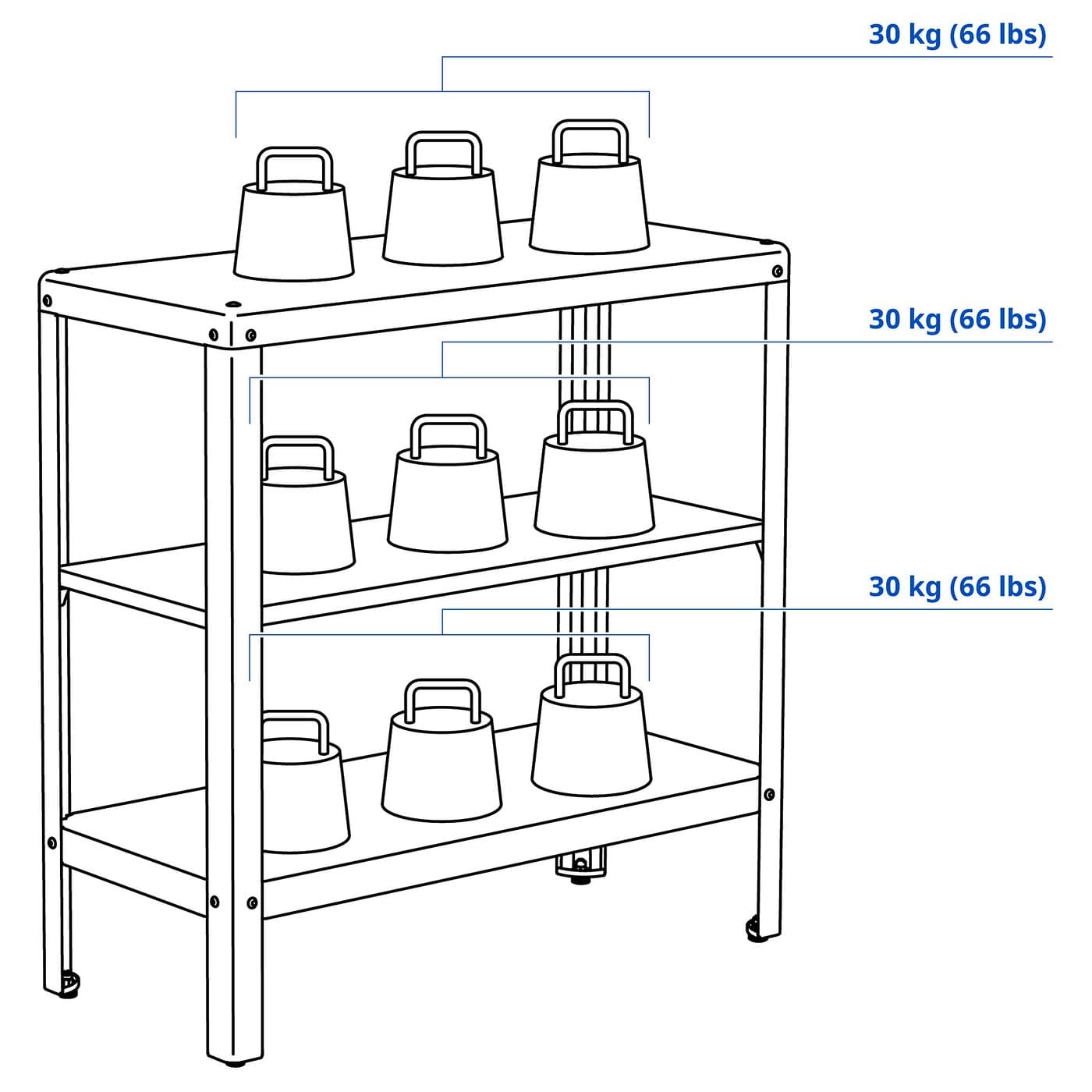 Для создания решения для хранения большего размера два стеллажа можно поставить один на другой или установить один стеллаж на шкаф КОЛЬБЬЁРН, который продается отдельно.