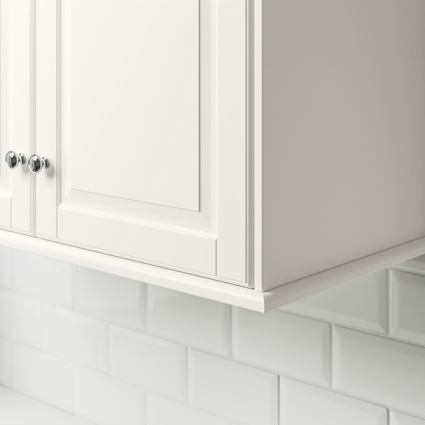 Можно использовать как декоративный карниз под навесными шкафами, чтобы спрятать подсветку, провода и розетки, а также установить на верхний край навесных и высоких шкафов.