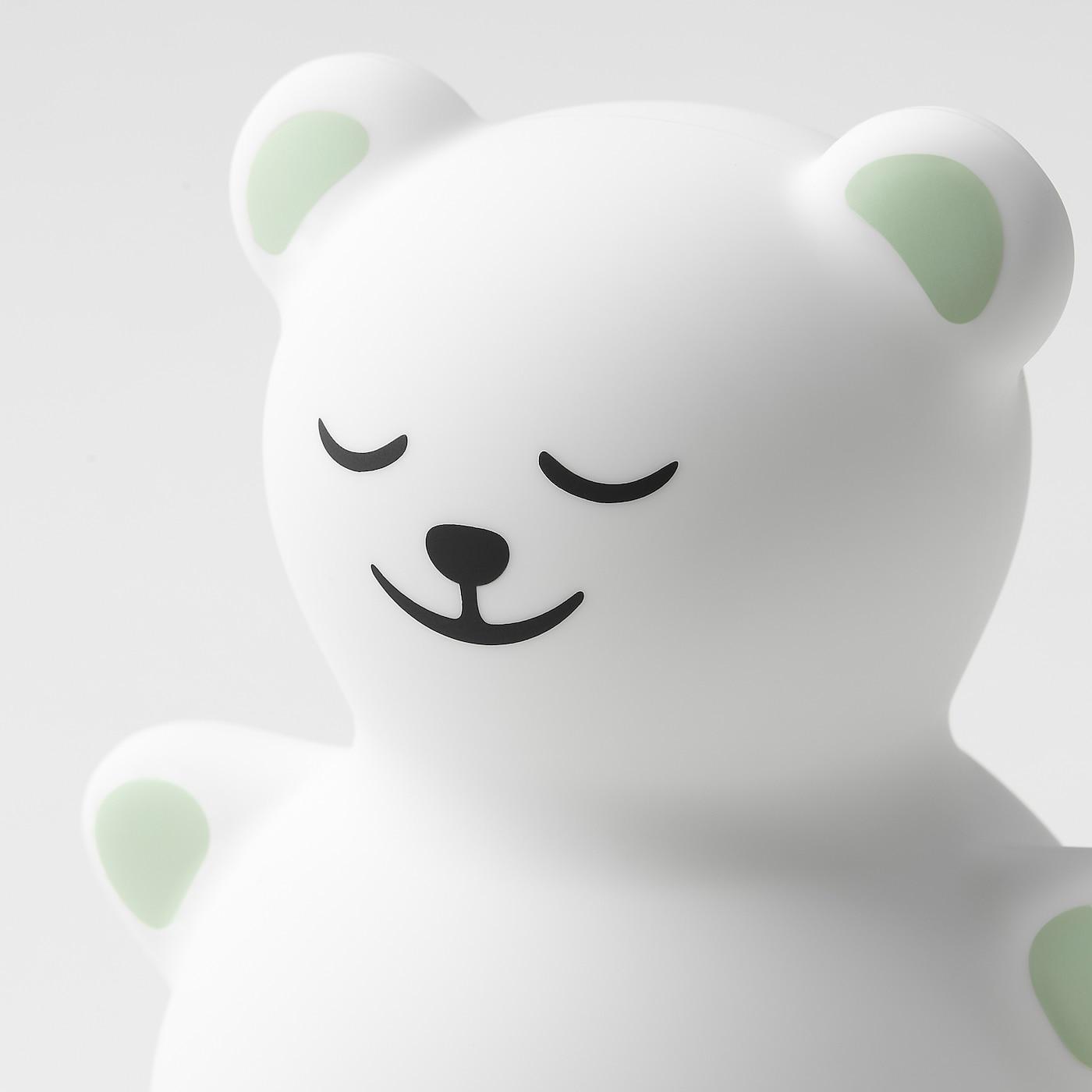На одной стороне лампы у медведя открытые глаза и ярко-желтые уши, а на другой — закрытые глаза и зеленые уши.