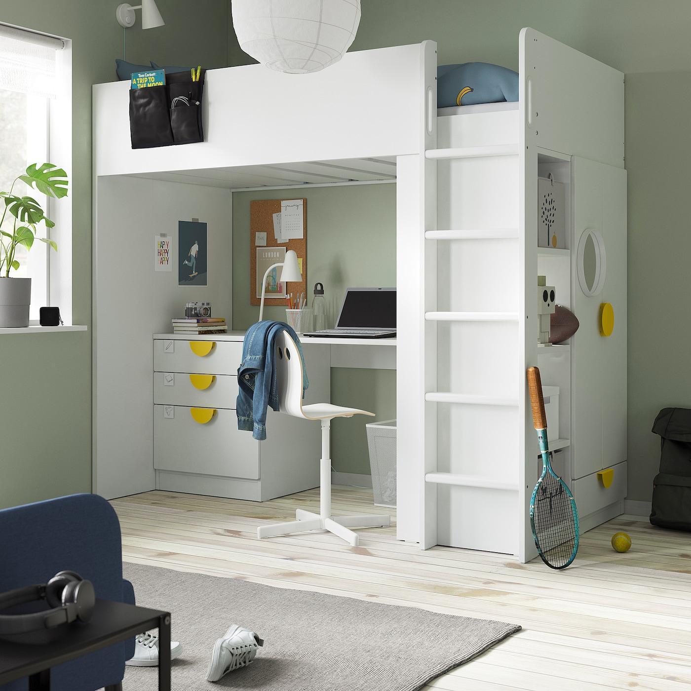 кровать-чердак, белый белый/с письменным столом с 4 ящиками, 90x200 см
